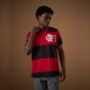 Camiseta retrô masculina de malha listrada com fio tinto de algodão que proporciona conforto e movimento. A peça possui CRF flocado e etiqueta bordada enaltecendo o ano de 1981 que o Flamengo conquista o título na libertadores.